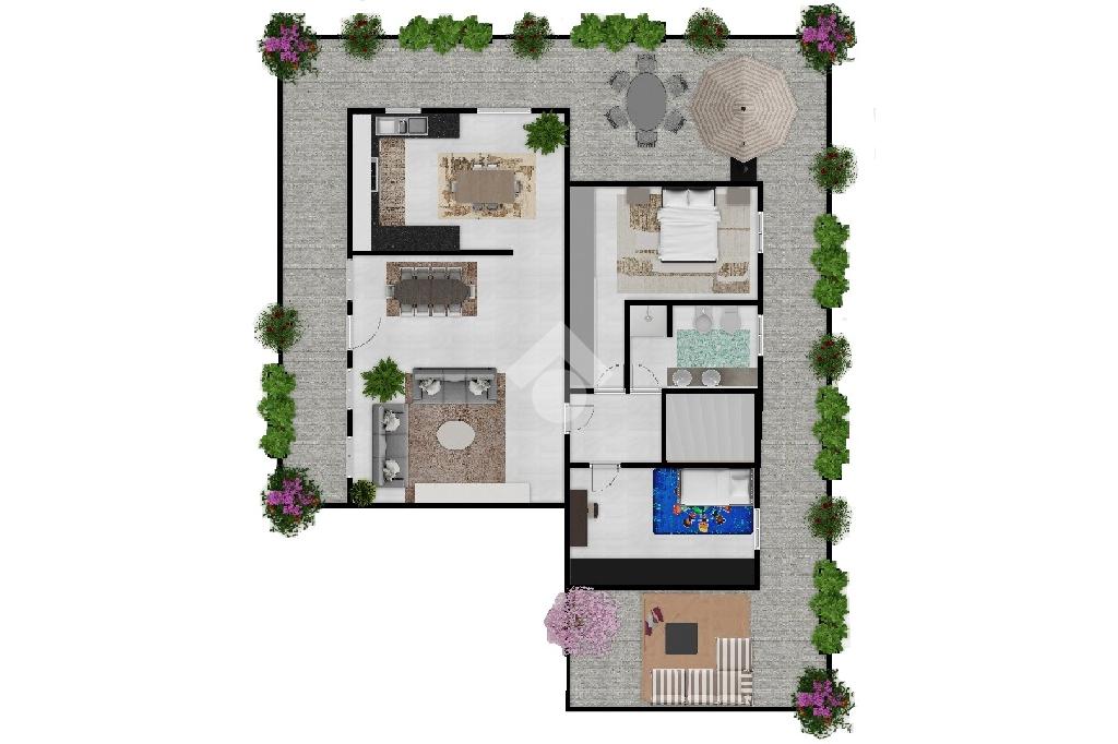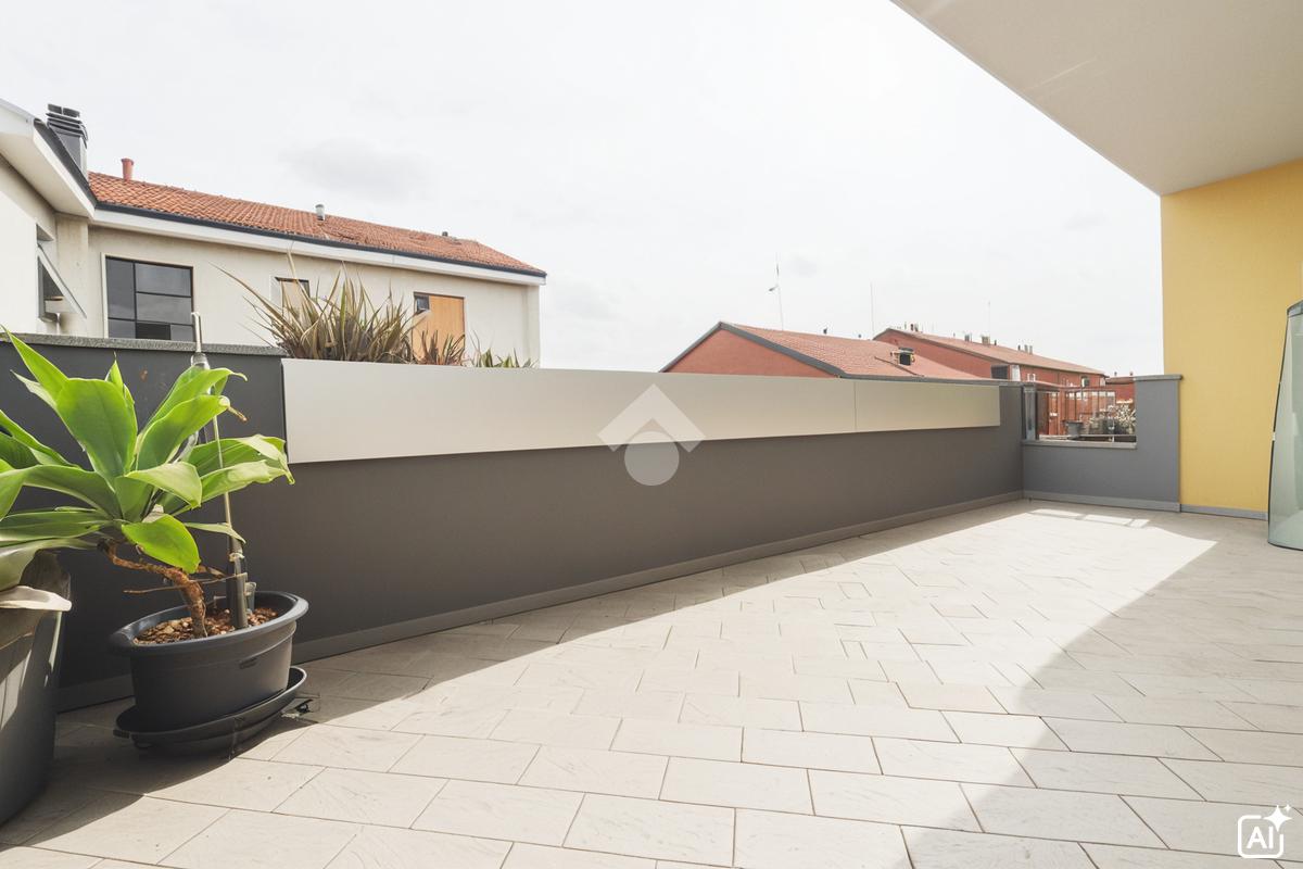 L'immobile si sviluppa su due livelli abitativi, offrendo un'incredibile varietà di spazi che si distinguono per la loro luminosità e le finiture di pregio. Già dall'ingresso indipendente si percepisce l'esclusività di questa proprietà: il grande terrazzo perimetrale abbraccia l'intero piano, offrendo uno spazio esterno godibile a 360 gradi creando un collegamento diretto tra gli spazi interni ed esterni ed offrendo un'ottima opportunità di vivere all'aperto in totale privacy. Ci accoglie un soggiorno doppio arricchito da un camino adiacente una cucina abitabile funzionale di generose dimensioni, che si apre anch'essa su una parte del terrazzo, favorendo momenti di convivialità e convivialità all'aperto. Un disimpegno conduce alla zona notte ove troviamo due confortevoli camere da letto, entrambe luminose e accoglienti oltre ad un bagno finestrato con doccia, rifinito con cura. Completa il piano un pratico ripostiglio nel sottoscala, che permette di mantenere gli spazi ordinati e funzionali. La scala in muratura, elemento di continuità stilistica, ci accompagna al piano superiore mansardato, dove trovano spazio due camerette, un secondo bagno e un ampio spazio versatile che può essere adibito a studio, zona living aggiuntiva o palestra, a seconda delle esigenze offrendo ulteriori spazi di relax e di svago. L'appartamento si distingue per il suo stile moderno, caratterizzato da una pavimentazione in ceramica di gusto contemporaneo e da infissi in PVC ad alto isolamento termico, garanzia di comfort abitativo e di efficienza energetica. Non mancano dettagli funzionali come le zanzariere, l'impianto di aria condizionata e l'allarme, per vivere in totale serenità. La quadrupla esposizione permette alla luce naturale di inondare gli ambienti durante tutto il giorno, rendendo ogni spazio particolarmente luminoso e accogliente. Gli ampi spazi interni e gli esterni, uniti alla cura dei dettagli e alle finiture eleganti, rendono questa casa unica nel suo genere. Inoltre, il prezzo di vendita include l'intero arredo presente offrendo così un'abitazione già pronta per essere vissuta senza ulteriori investimenti. Completano la soluzione una cantina ed un ampio box di proprietà al prezzo di 26.000 €