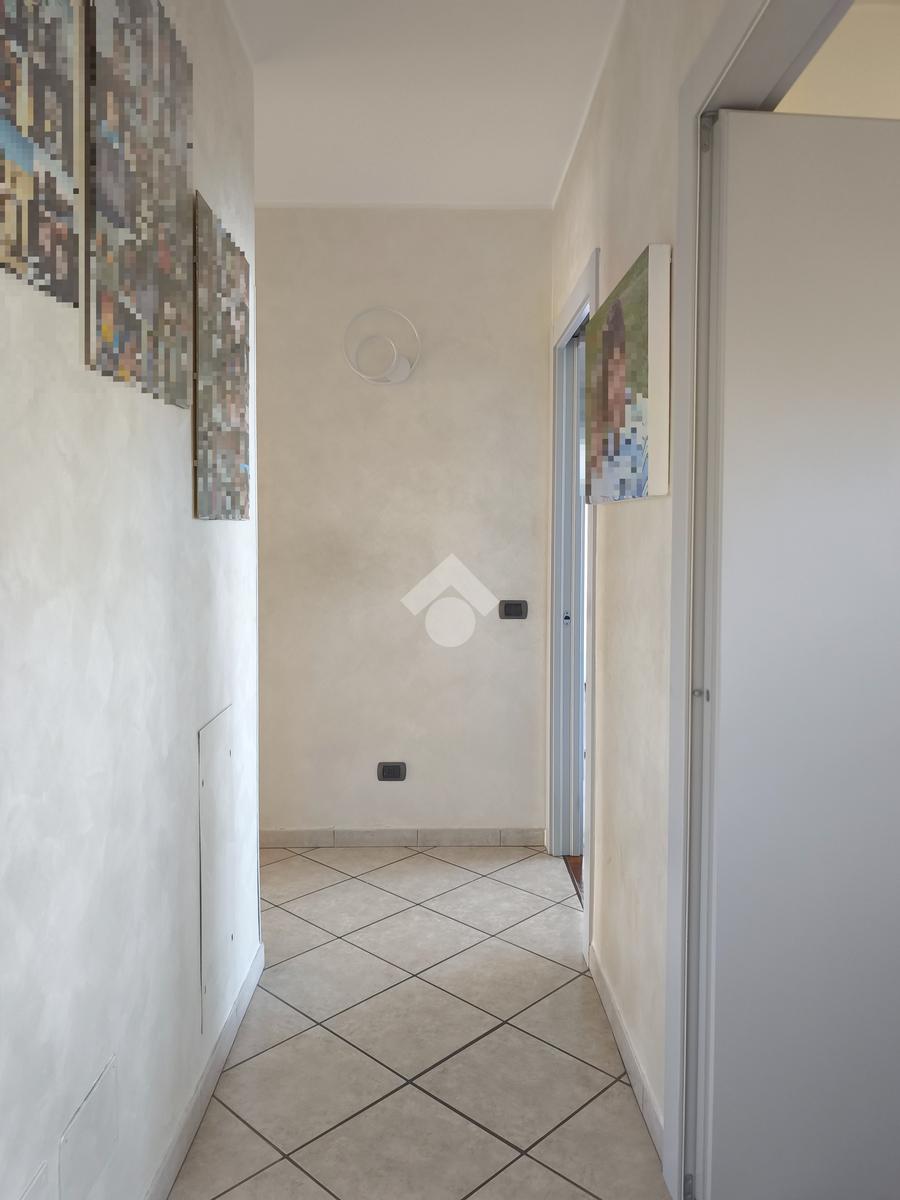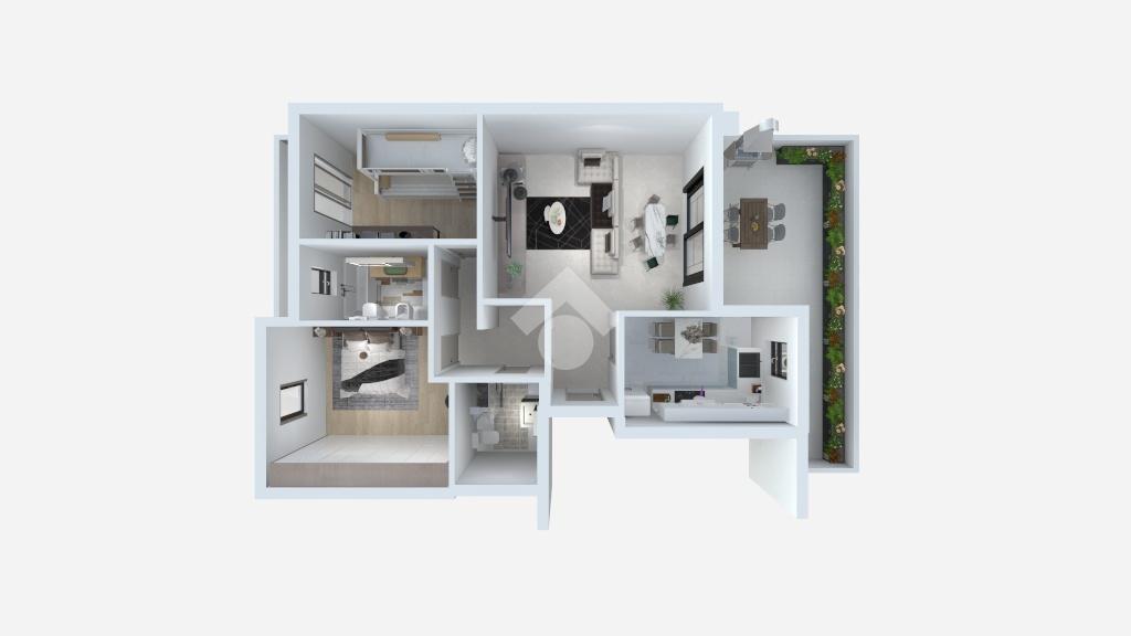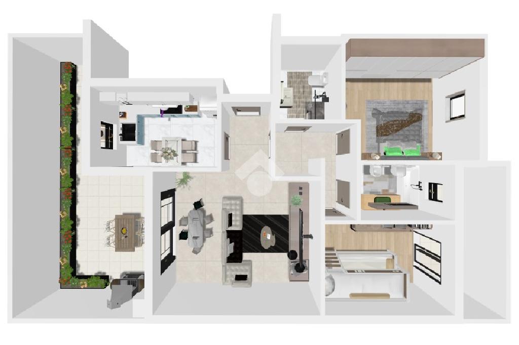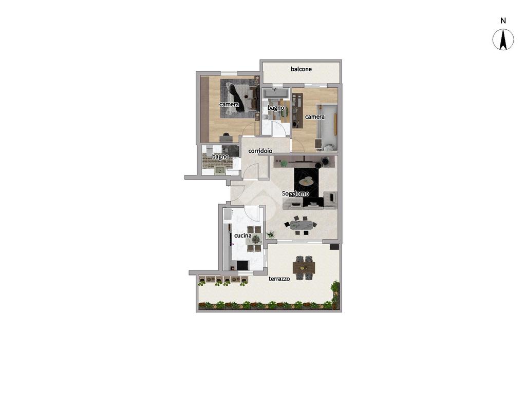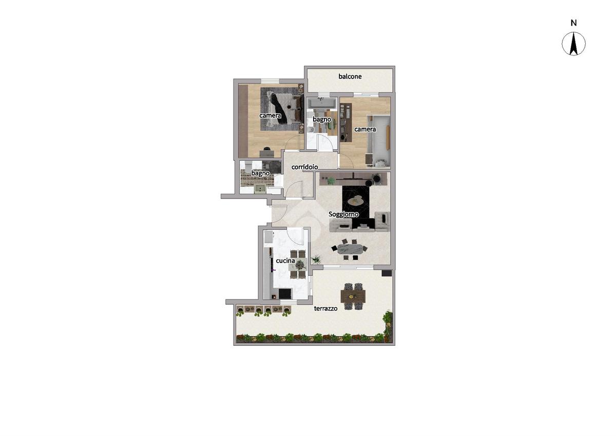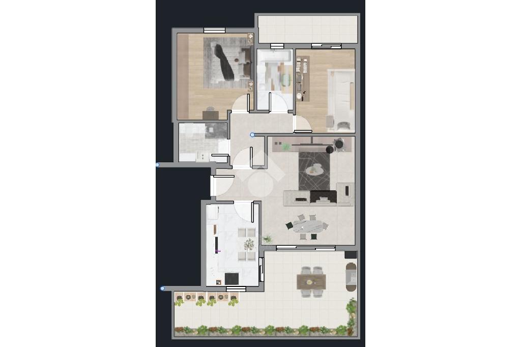 L'ingresso ci introduce in un disimpegno che conduce da un lato alla cucina abitabile e dall'altro al luminoso soggiorno, entrambi con affaccio diretto sul terrazzo, così da creare una continuità tra gli ambienti interni e l'ampio spazio esterno.