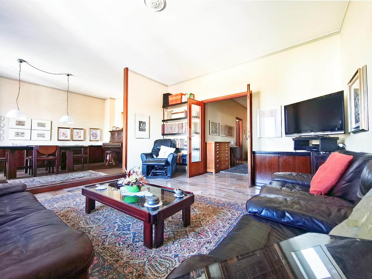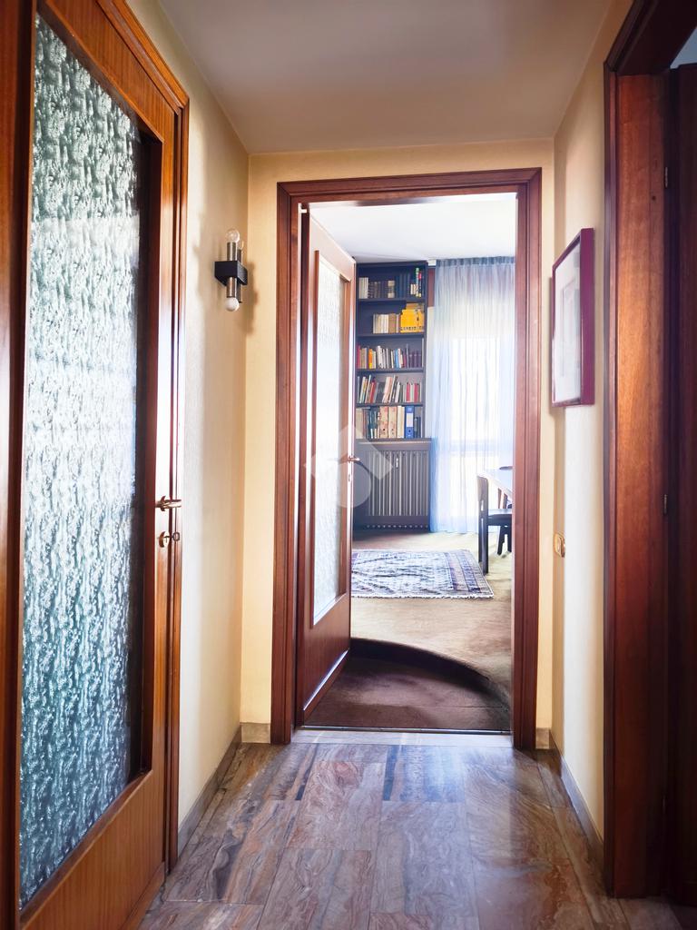 Originariamente concepita come una soluzione di quattro locali, la casa è stata sapientemente trasformata in un ampio trilocale, dove la quarta camera è stata annessa al soggiorno per dare vita a una zona living doppia, di grande impatto visivo e funzionale, impreziosita da una balconata che corre lungo una delle pareti, regalando luce naturale durante tutto l’arco della giornata.