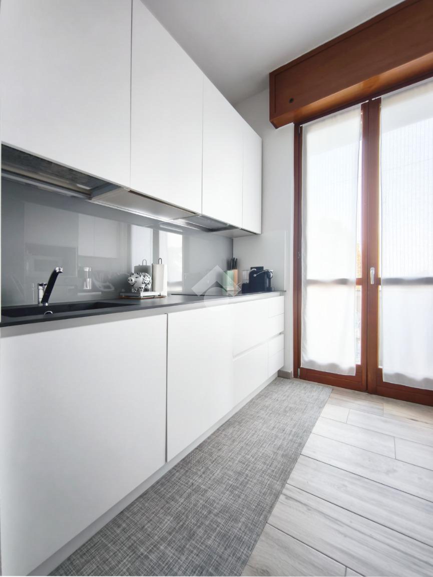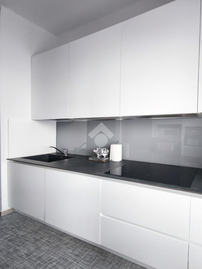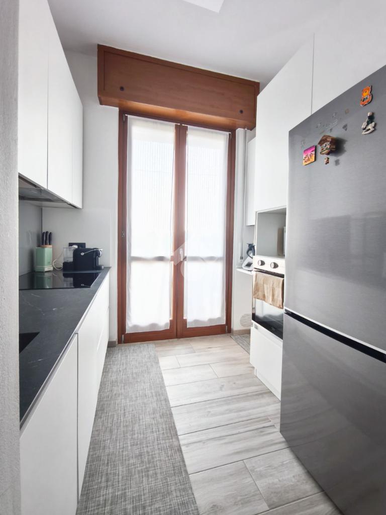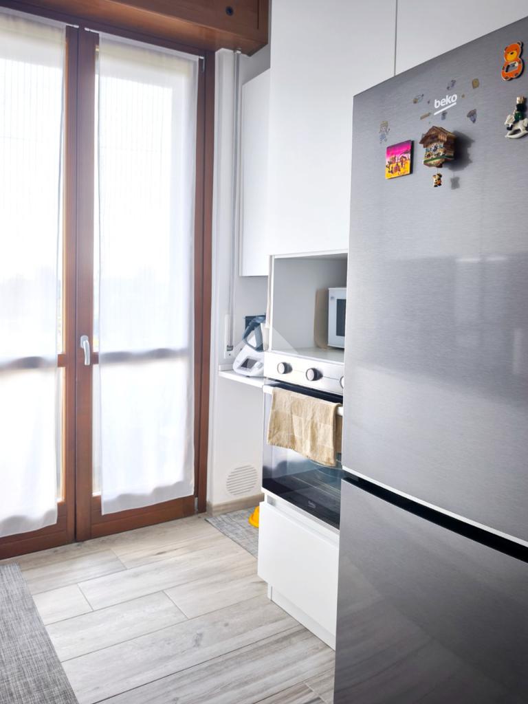 La cucina è semi abitabile, anch'essa dotata di un balcone ma, grazie ad un arredo su misura, è stata valorizzata attrezzandola con elettrodomestici moderni e spazi di lavoro ben organizzati.
