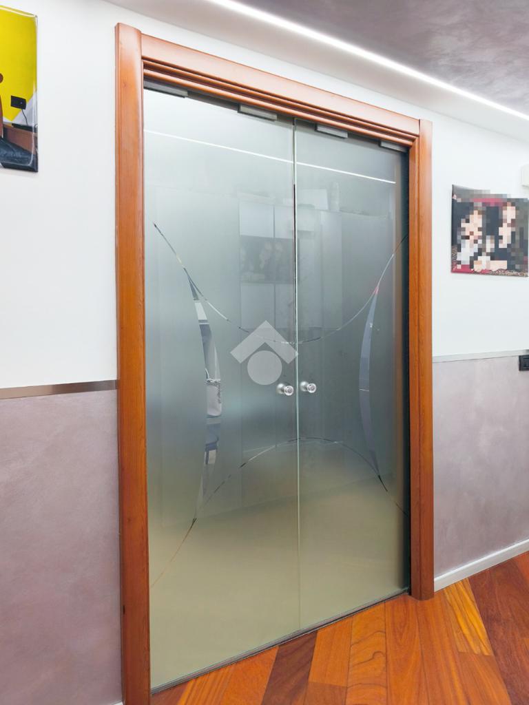L'intera dimora è stata finemente ristrutturata con materiali di pregio che ne esaltano l'anima contemporanea. Il calore del parquet avvolge ogni stanza, creando un contrasto raffinato con le porte interne, dove l'eleganza del legno si alterna alla modernità del cristallo.