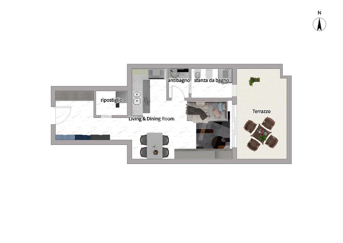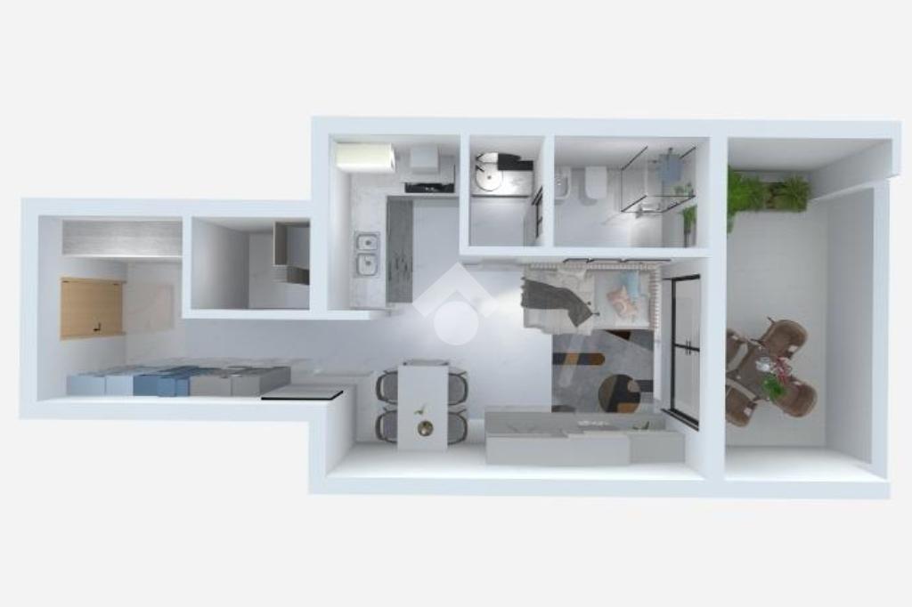Il vero fiore all’occhiello è l’ampio terrazzo loggiato uno spazio esterno generoso, raro per questa tipologia di immobili, che funge da vera e propria estensione della casa.