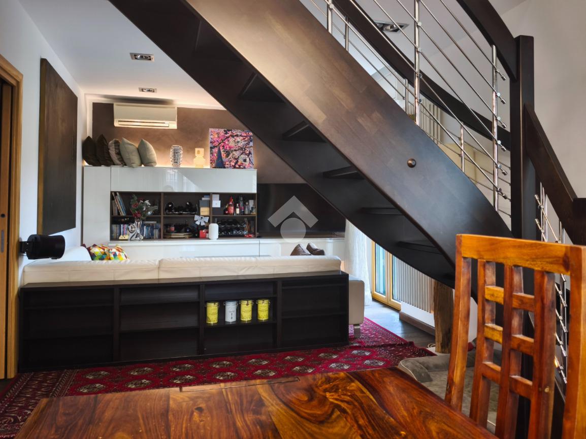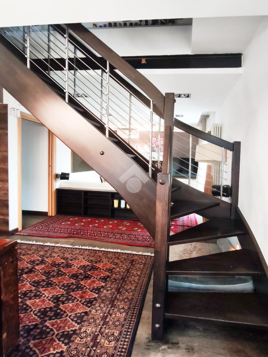 Qui, una scenografica scala diventa elemento di design e conduce con eleganza al piano superiore.
