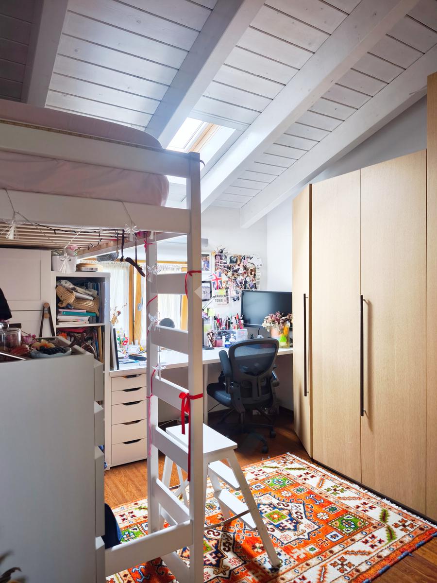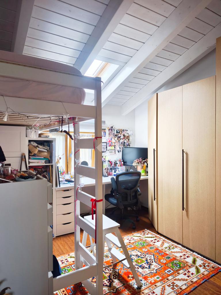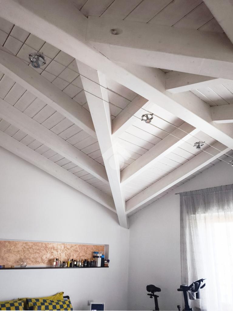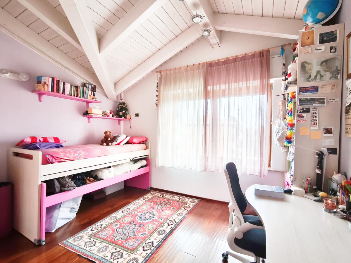 Salendo al piano superiore, vi accoglie la zona notte, un rifugio di tranquillità impreziosito da un alto soffitto con suggestive travi a vista.