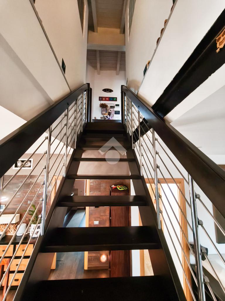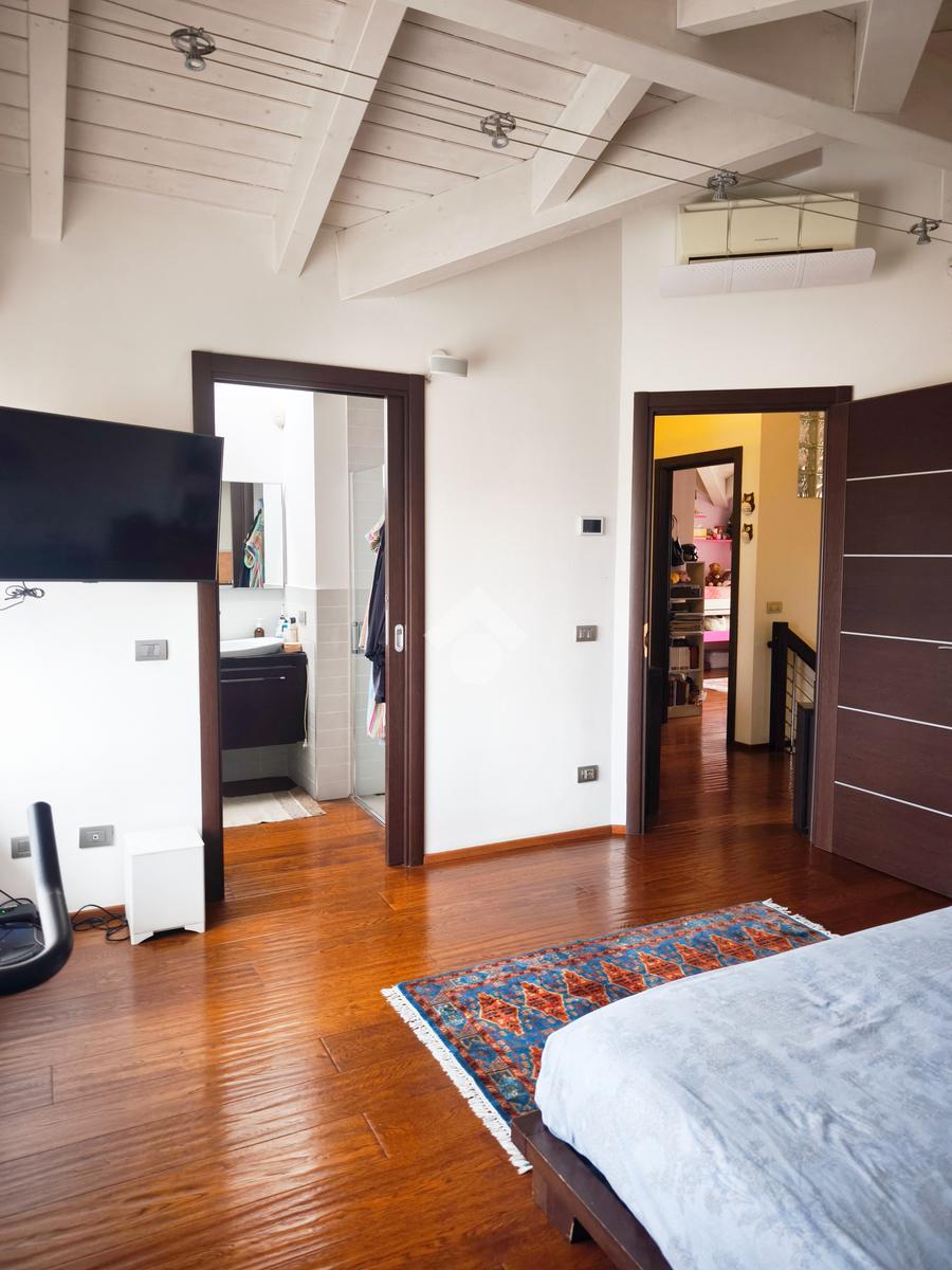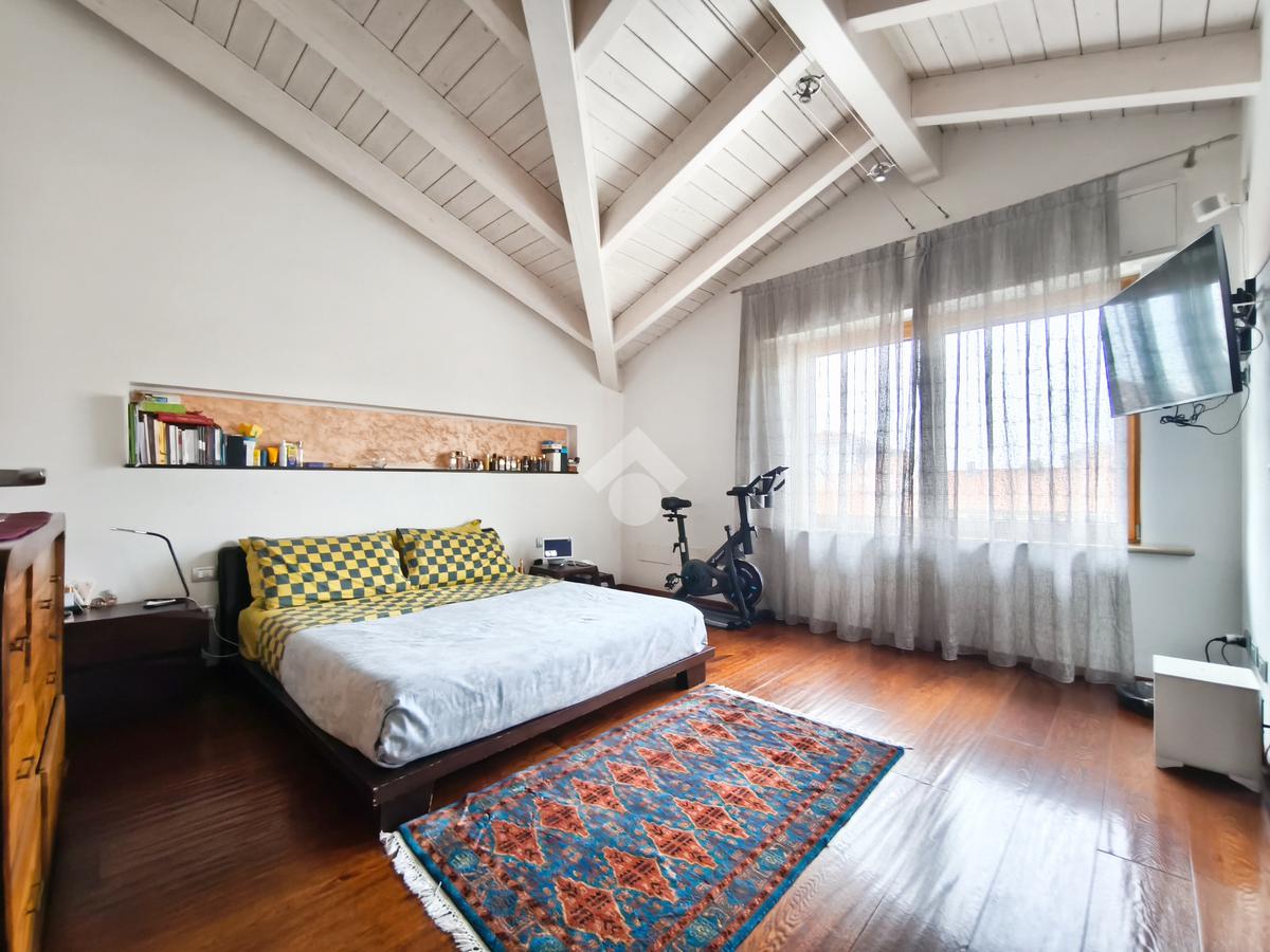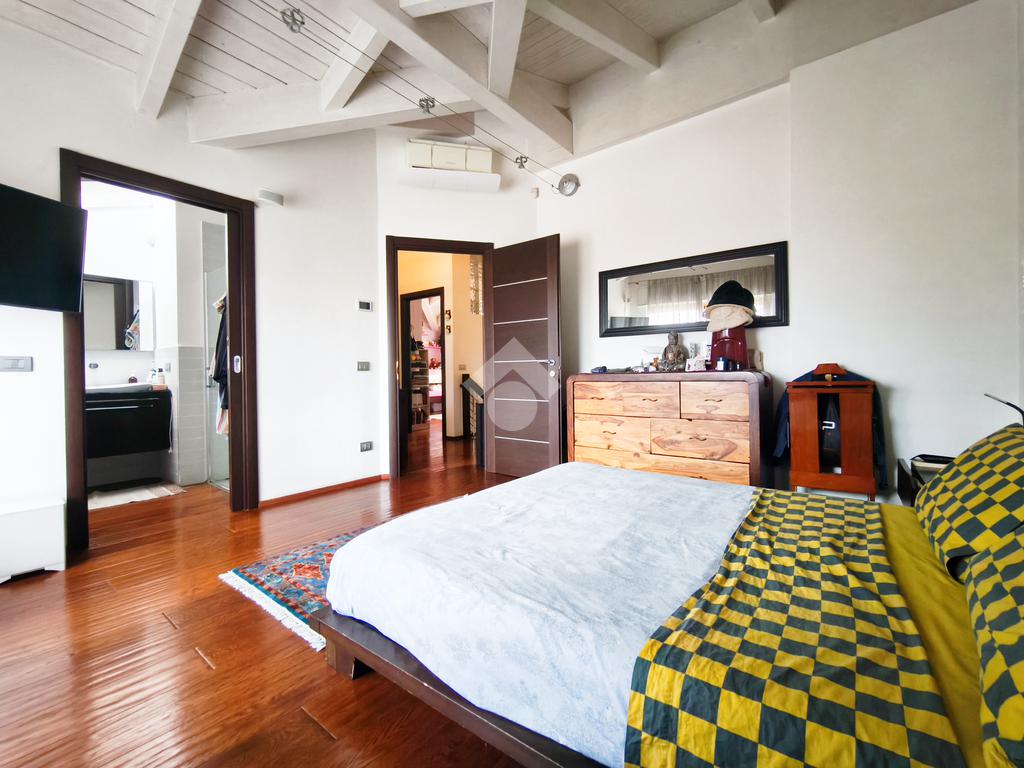 Salendo al piano superiore, vi accoglie la zona notte, un rifugio di tranquillità impreziosito da un alto soffitto con suggestive travi a vista.