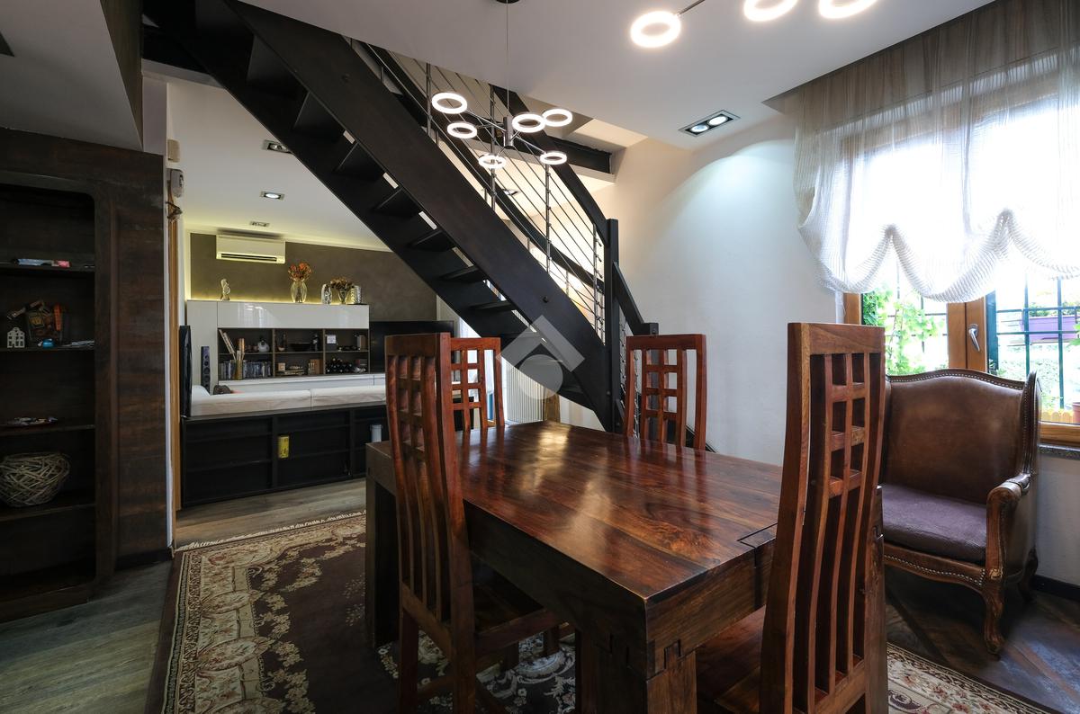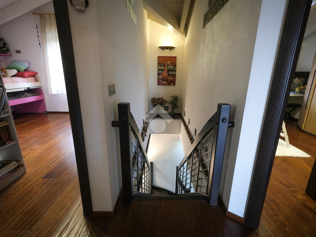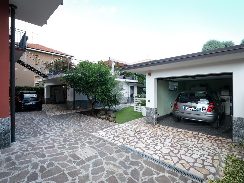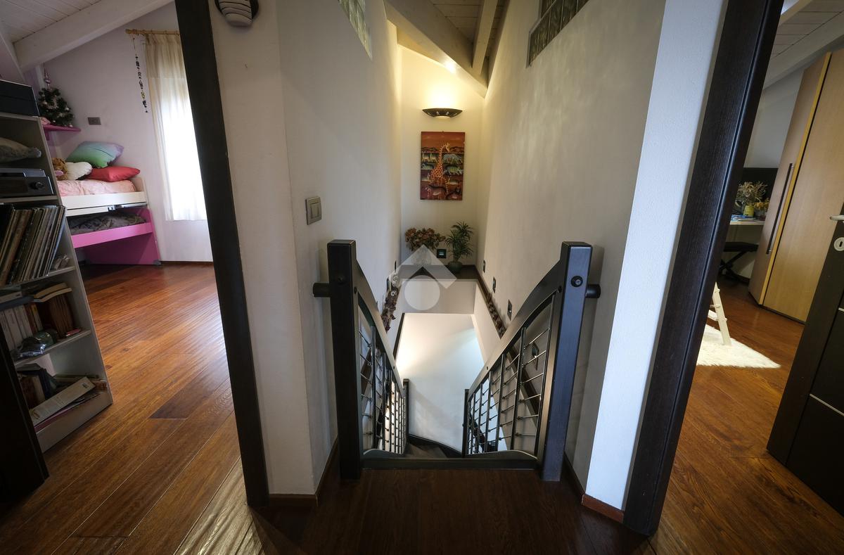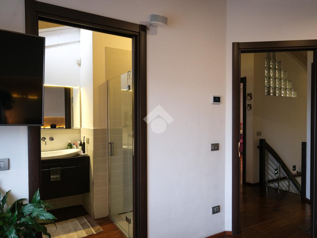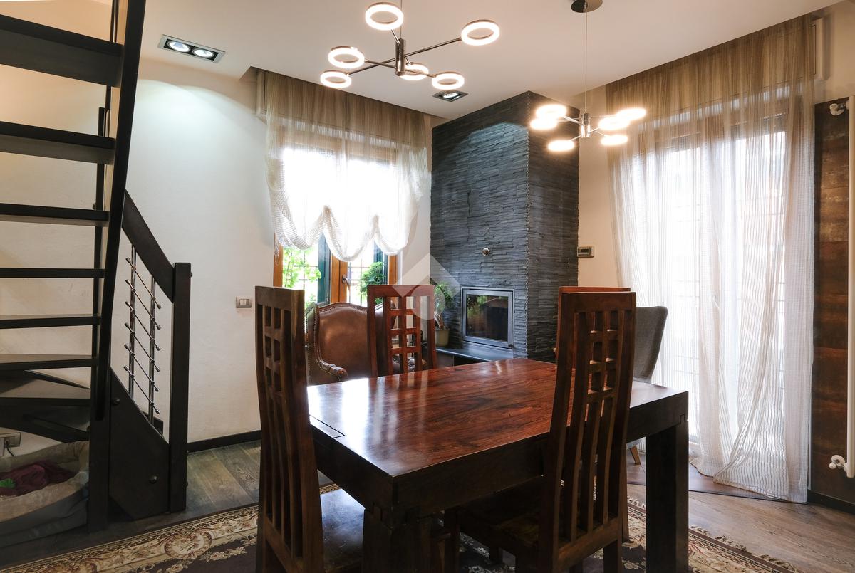 APPARTAMENTO DUE DUE LIVELLI: Il secondo appartamento si estende sui due ampi livelli superiori, offrendo spazi generosi e una scenografia interna di grande impatto. L'ingresso (al piano primo) conduce a un soggiorno doppio da cui una scenografica scala diventa elemento di design e connette elegantemente al piano superiore. La zona giorno è completata da una cucina abitabile, un bagno di servizio, uno studio e un ripostiglio. Salendo, la zona notte accoglie con un alto soffitto e suggestive travi a vista, tre camere da letto, inclusa una master suite con bagno privato riservato. Questo livello vanta anche un terzo bagno e un ampio locale finestrato adibito a lavanderia. Anche questa unità viene venduta completamente arredata con mobilio di altissimo livello. Ciò che rende questa villa unica è il livello di ristrutturazione esteso all'intero fabbricato. Entrambe le unità e l'involucro edilizio beneficiano di: cappotto esterno per un elevato isolamento termico; riscaldamento a pavimento e aria condizionata canalizzata per un clima perfetto in ogni stagione; impianto fotovoltaico e pannelli solari per un notevole risparmio energetico e sostenibilità; domotica per una gestione domestica moderna e semplificata; parquet di pregio che riveste elegantemente tutti gli ambienti interni. A completamento dell'offerta e per il massimo della comodità un box singolo (€ 20.000,00) ed un ampio box doppio (€ 50.000,00).